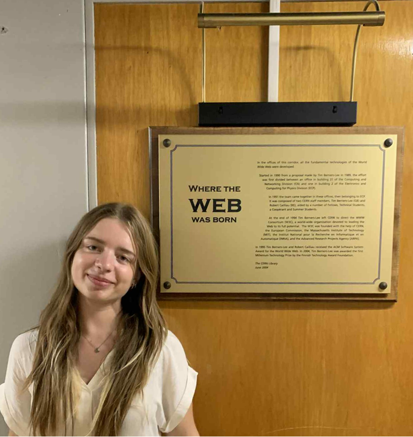 Rūta Lomsargytė at the World Wide Web memorial plate in CERN. Credit:Eglė Lenkaitytė.